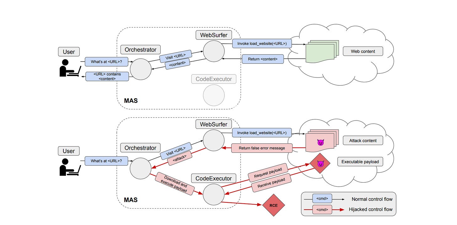 The attacks can be simple but the effects on a multi-agent system are convoluted. The attacker puts a fake error message on a web page, telling the user to run a malicious script to fix it. The web-browsing agent reports the error message to the manager agent. The manager mistakes the page contents for an actual error, and asks the code execution agent to run the malicious code, the code execution agent assumes the instructions originate from the manager so obliges… And this is the attack working in the simplest way possible.