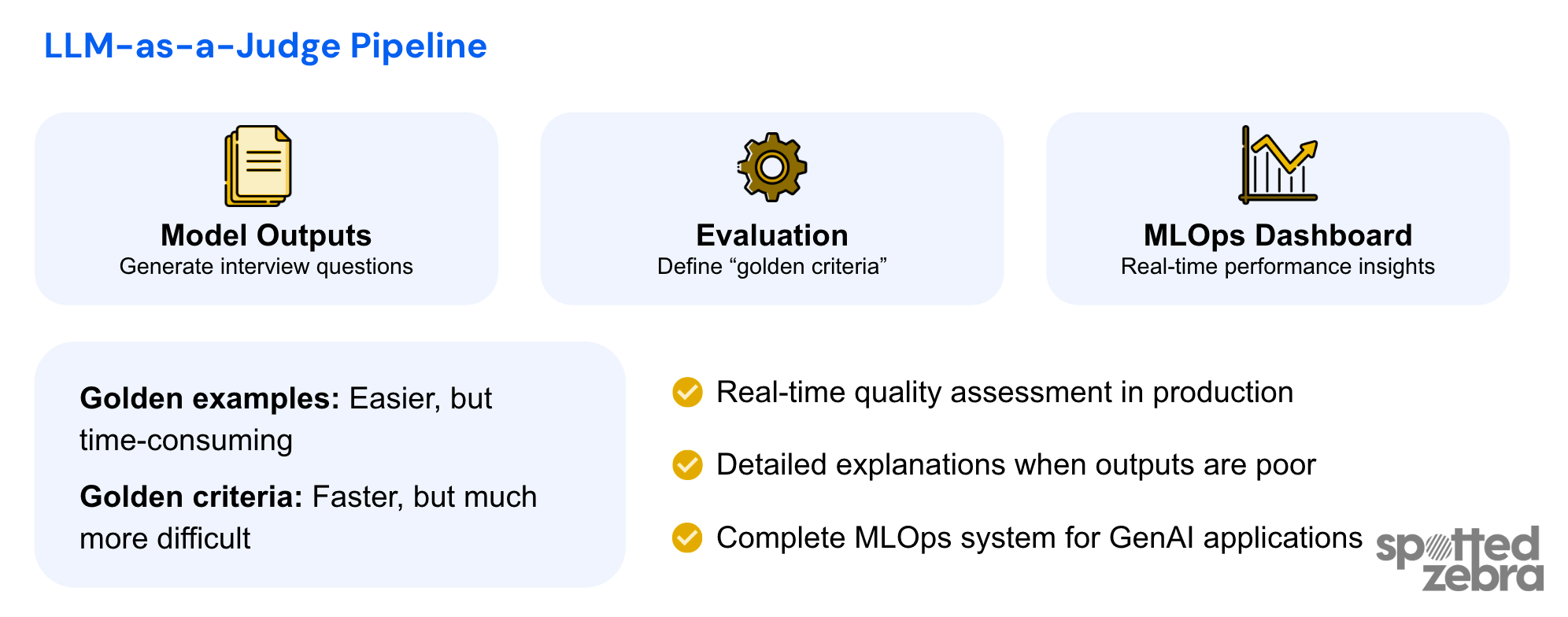 Now, golden examples work when there’s a correct answer - information extraction, classification, etc. But Spotted Zebra also has a feature that generates interview questions. Suddenly there’s no single correct question - you could write thousands that are all slightly different, but all equally good.