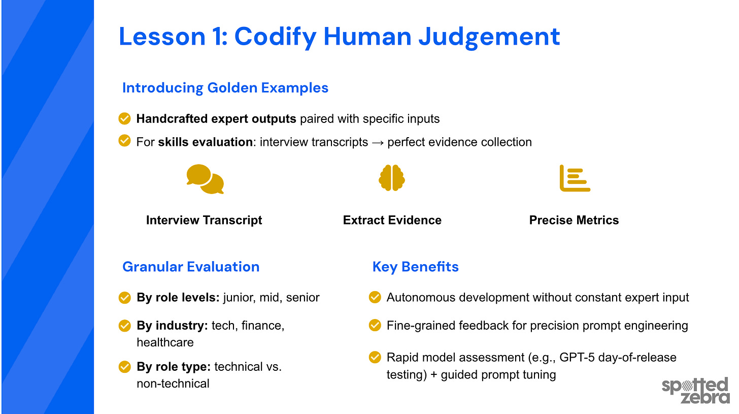 A golden example is a document where you define exactly what the correct output should be for a given input. For Skills Evaluation, that means: interview transcript goes in, correctly extracted evidence comes out. You create a set of these with your domain experts, and that becomes your gold standard to test against.